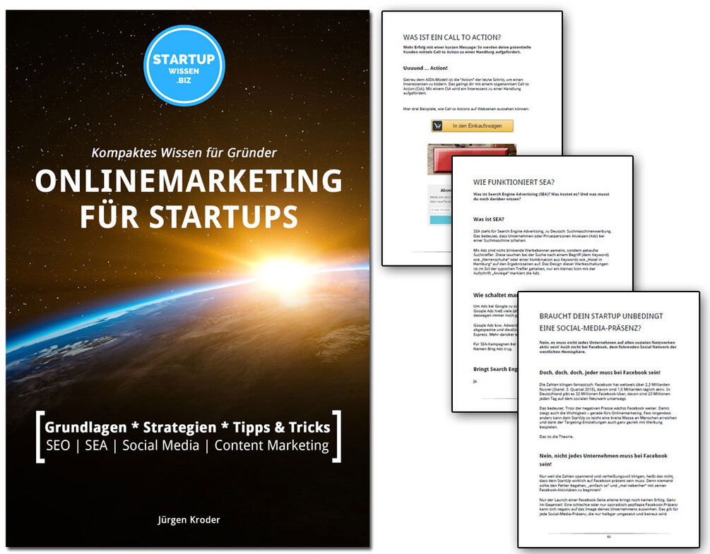 Das beliebte eBook führt dich in die Themenbereiche SEO, SEA, Social Media, Content Marketing, Videos und Webdesign ein. Zudem es zeigt dir, wie du mit Grips und Kreativität die Online-Vermarktung deines StartUps erfolgreich meisterst.